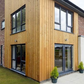 Externally this house could have looked very bland, but thought was put into the elevations breaking the brick up with timber cladding and render along with gun metal grey UPVC windows-over the mandatory white.